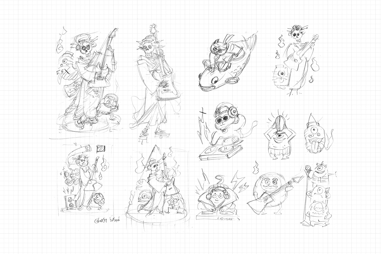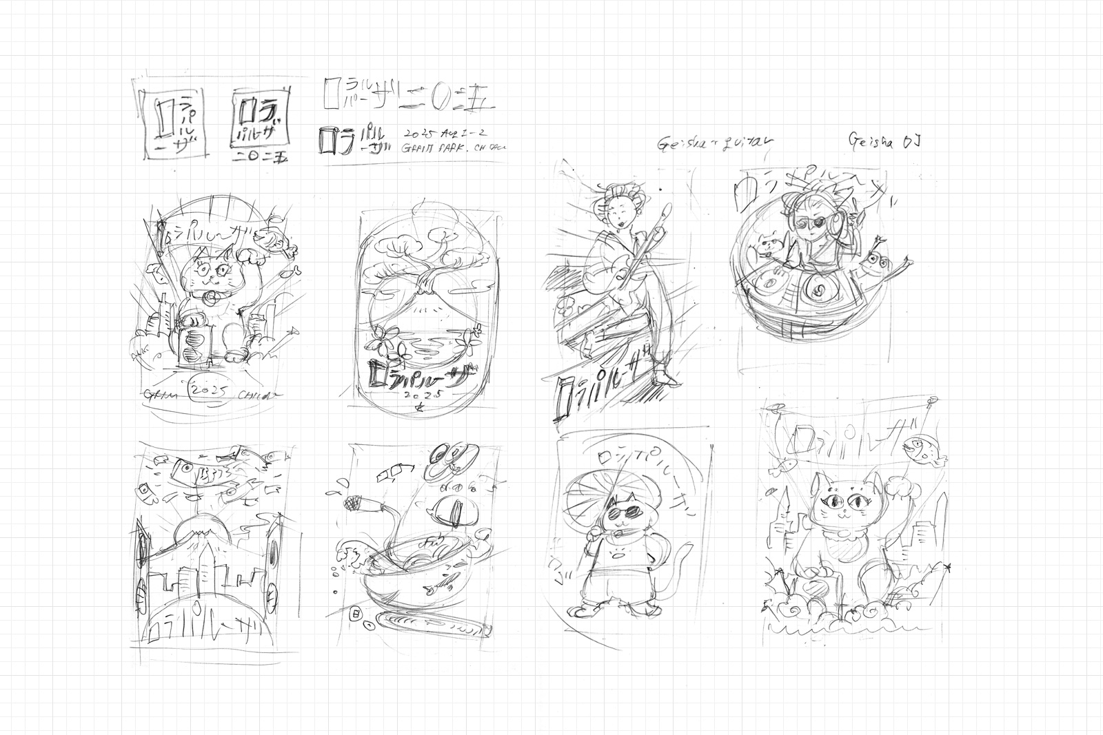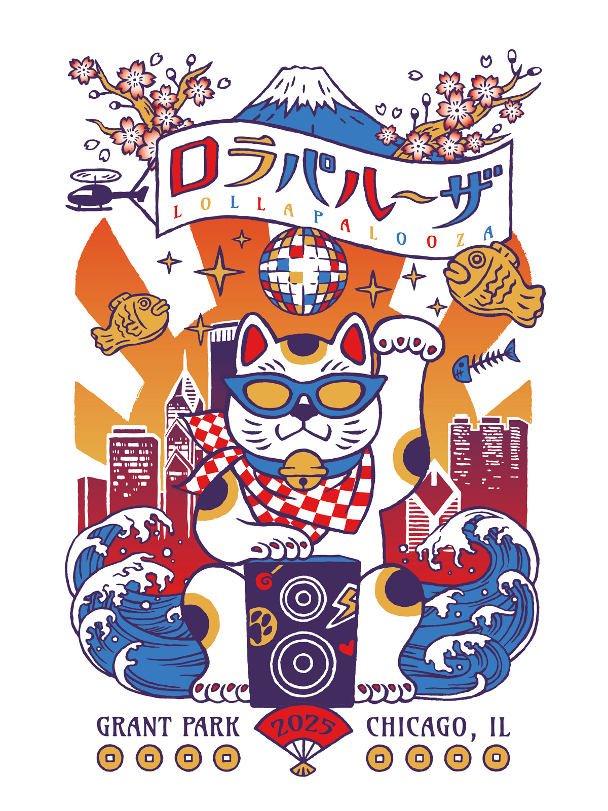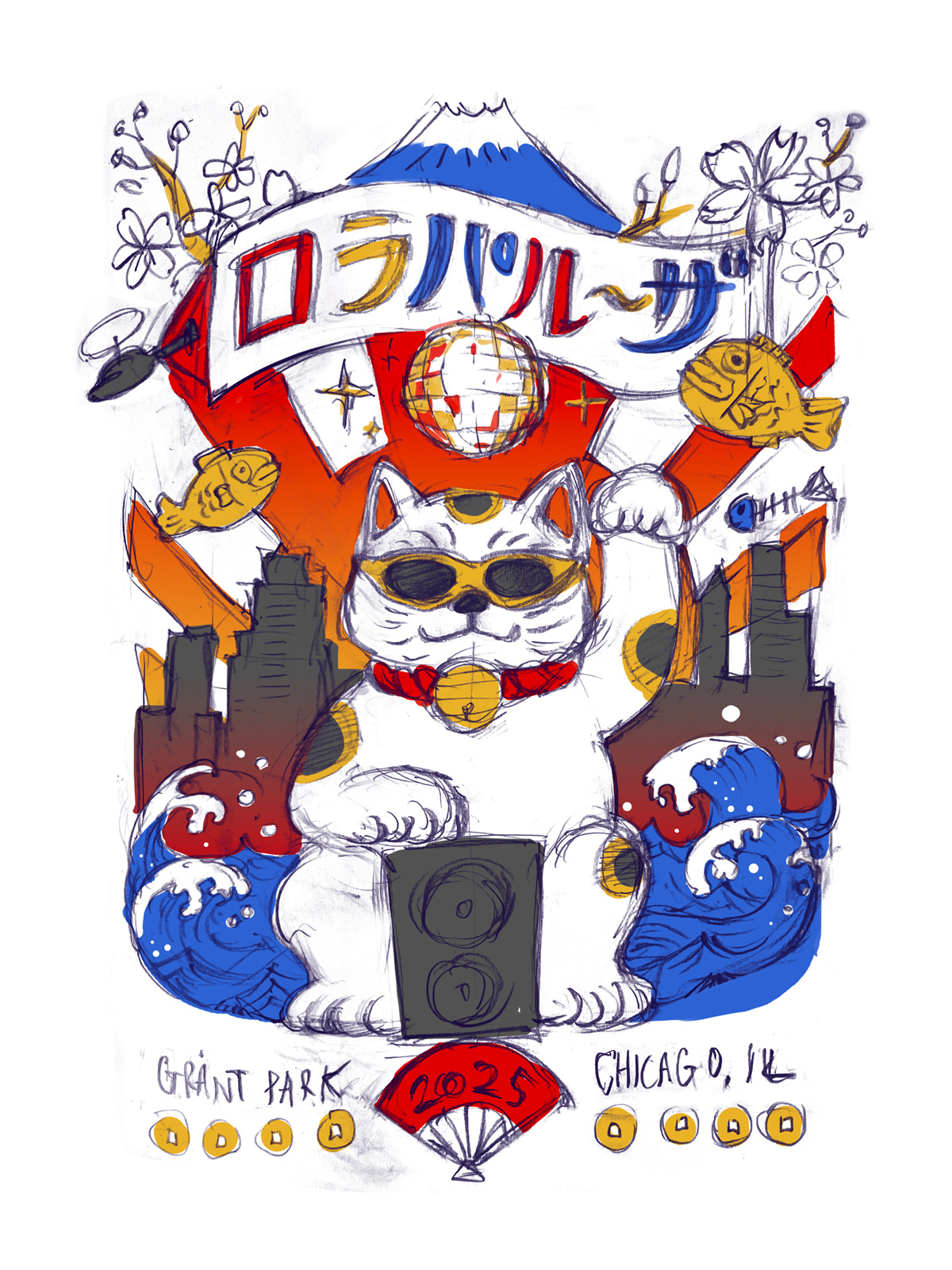 初期の草稿では、ロラパルーザのエネルギッシュで多様な雰囲気に自然になじむような日本のモチーフを模索し、ユニークな組み合わせを考案しました。例えば妖怪のバンド、芸者のギタリスト、化け猫のDJ、そして富士山を背景にしたシカゴのスカイラインなどです。