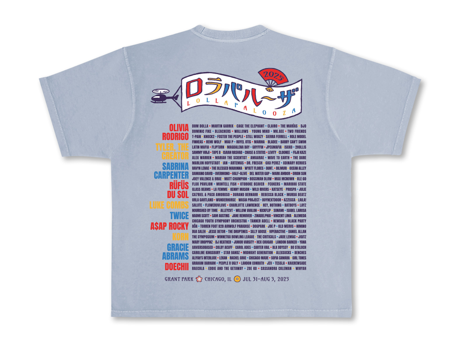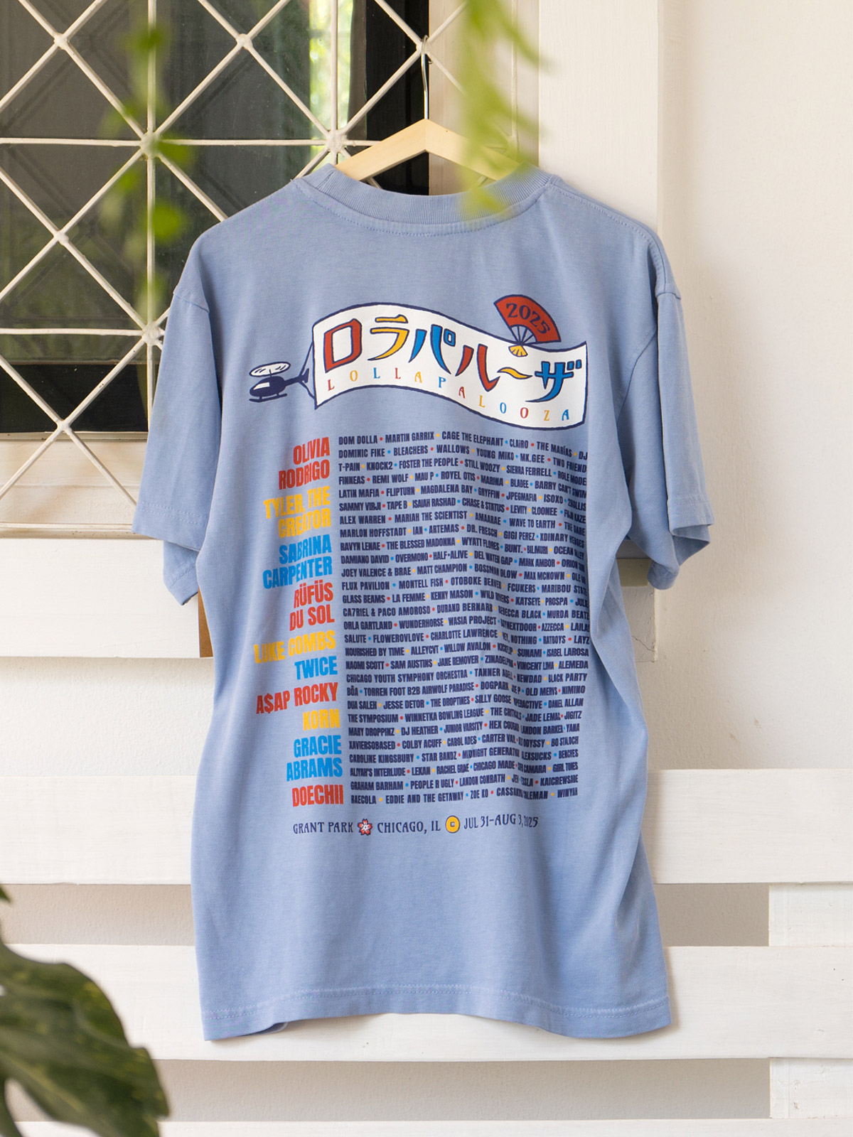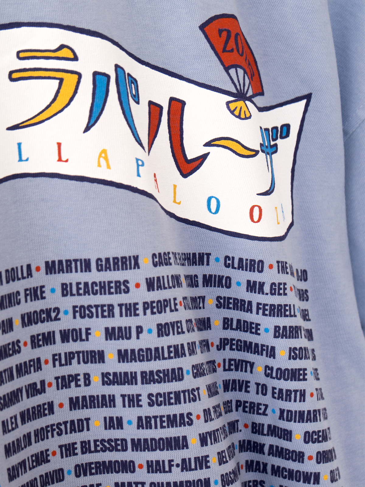 完成したユニセックスTシャツはライトブルーのオーバーサイズで、複数サイズで展開されています。現在、ロラパルーザの公式グッズウェブサイトにてプレオーダーが可能です。