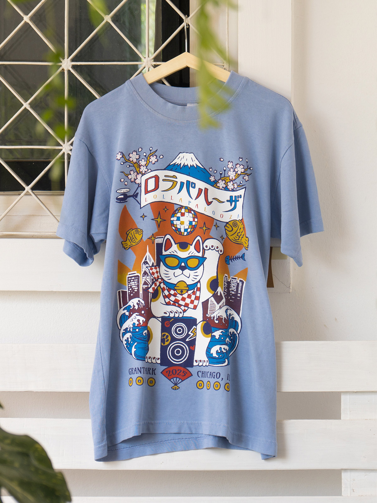 イラストはTシャツ前面に印刷され、日本を象徴する日の出に彩られたシカゴのスカイラインをバックに、フェスティバルに向けて着飾った招き猫を中心に描いています。ヘリコプターの垂れ幕には敢えてカタカナで大きく「ロラパル〜ザ」と書き、下に小さく英文を添えることで、日本をコンセプトにしたイラストであることがすぐ伝わるようにしています。(ロラパルーザの「ー」を「〜」としたのは、出演アーティストおとぼけビ〜バ〜へのオマージュです)