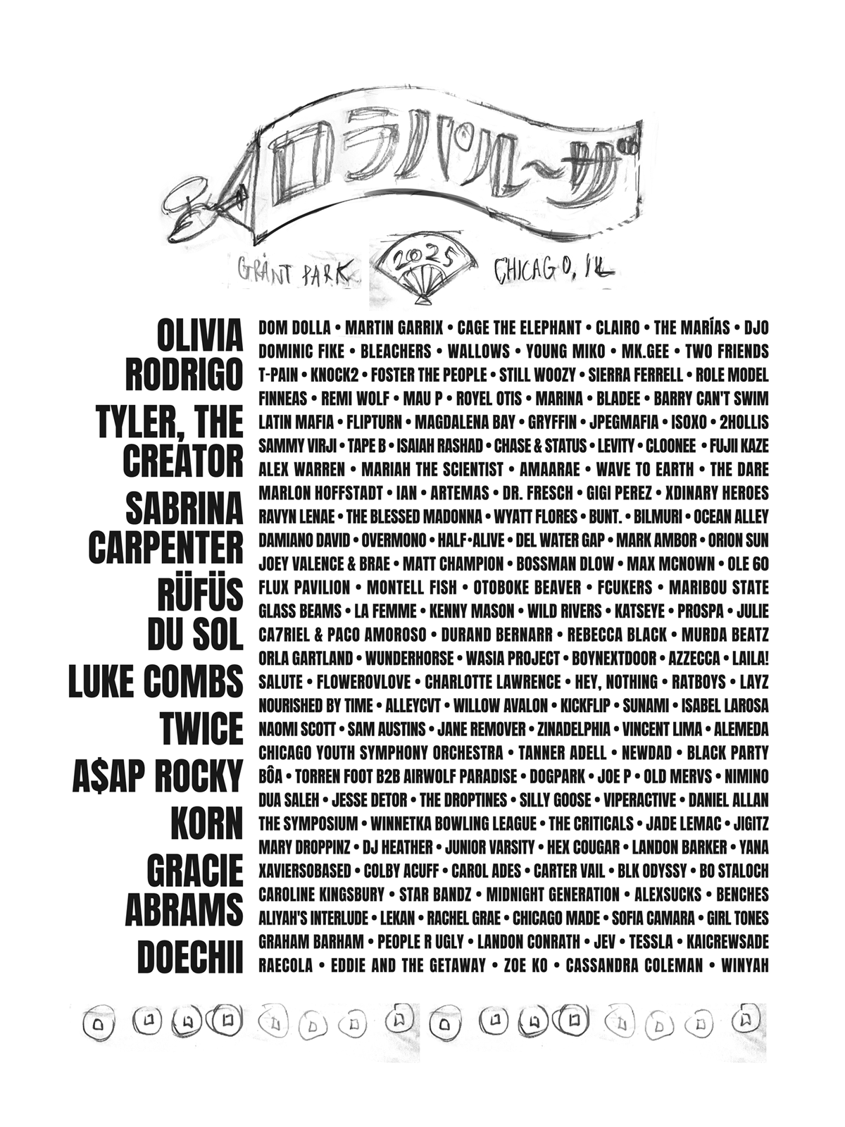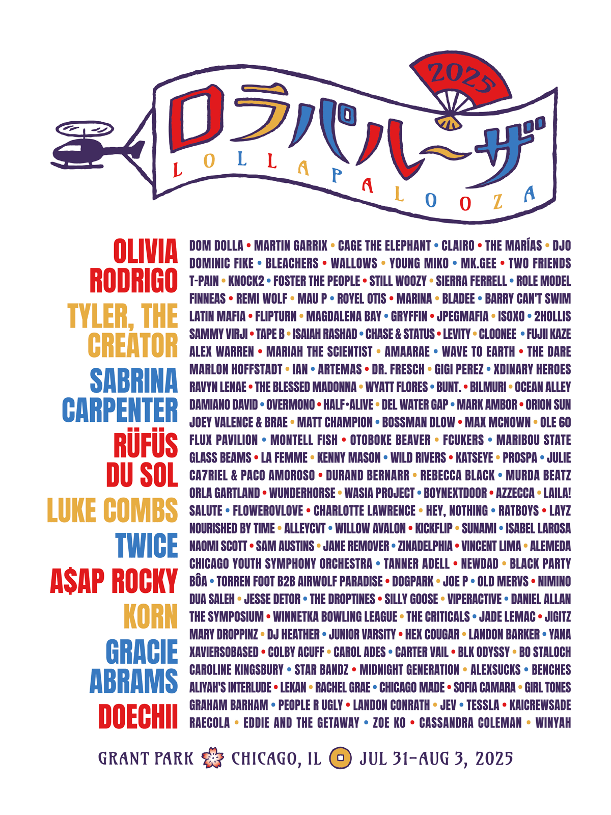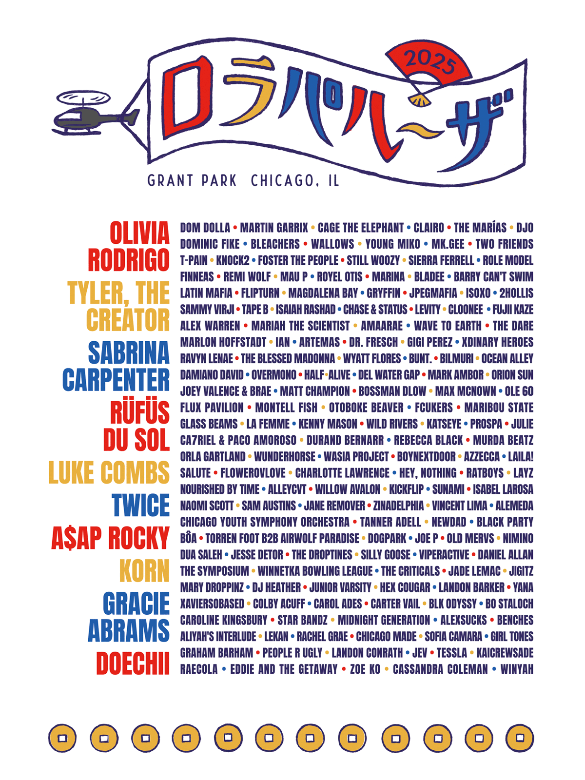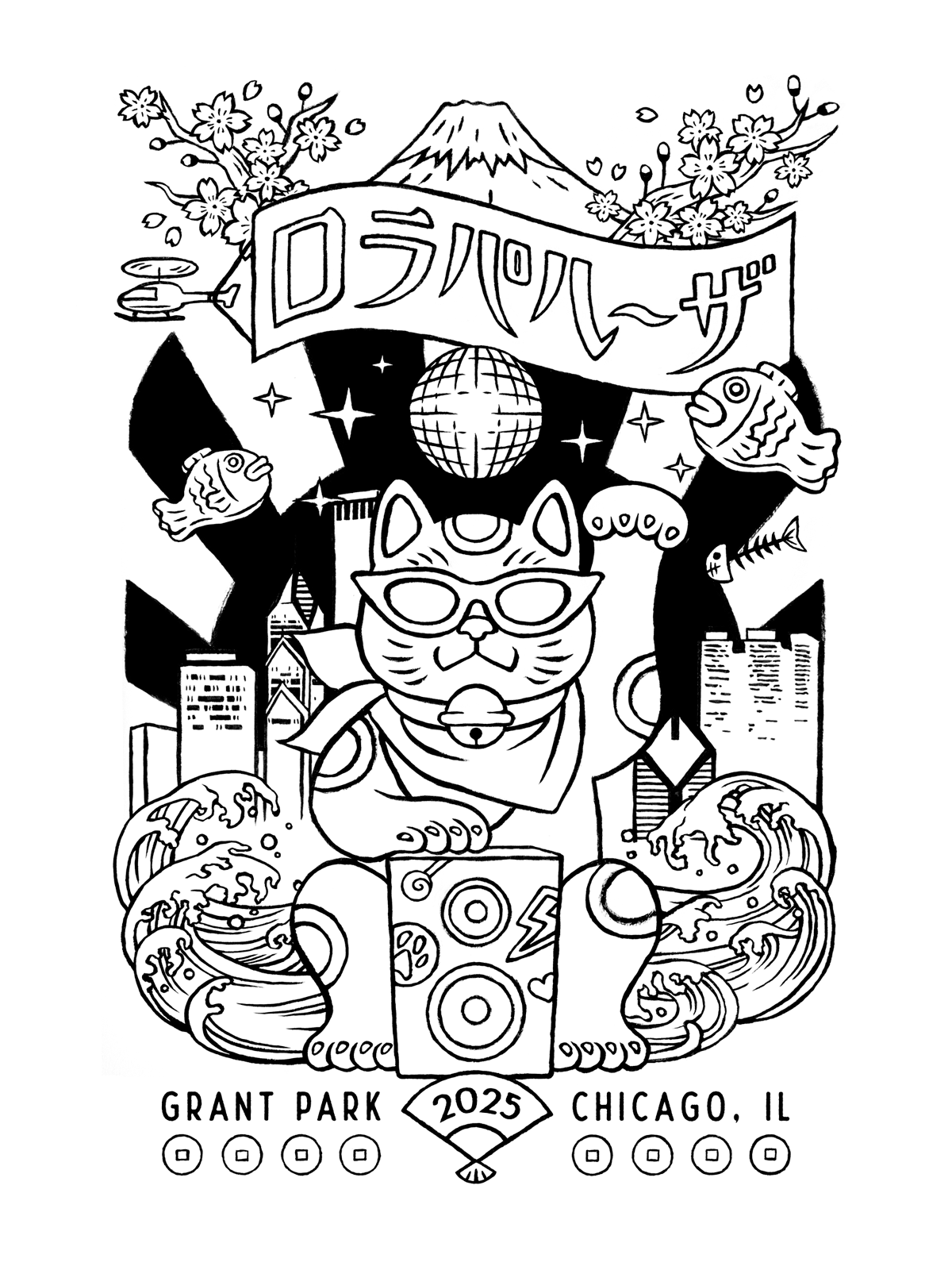 アメリカ、イリノイ州シカゴのグラント・パークで毎年開催されている野外音楽フェス、ロラパルーザの2025年開催Tシャツのイラスト、デザインを作成しました。