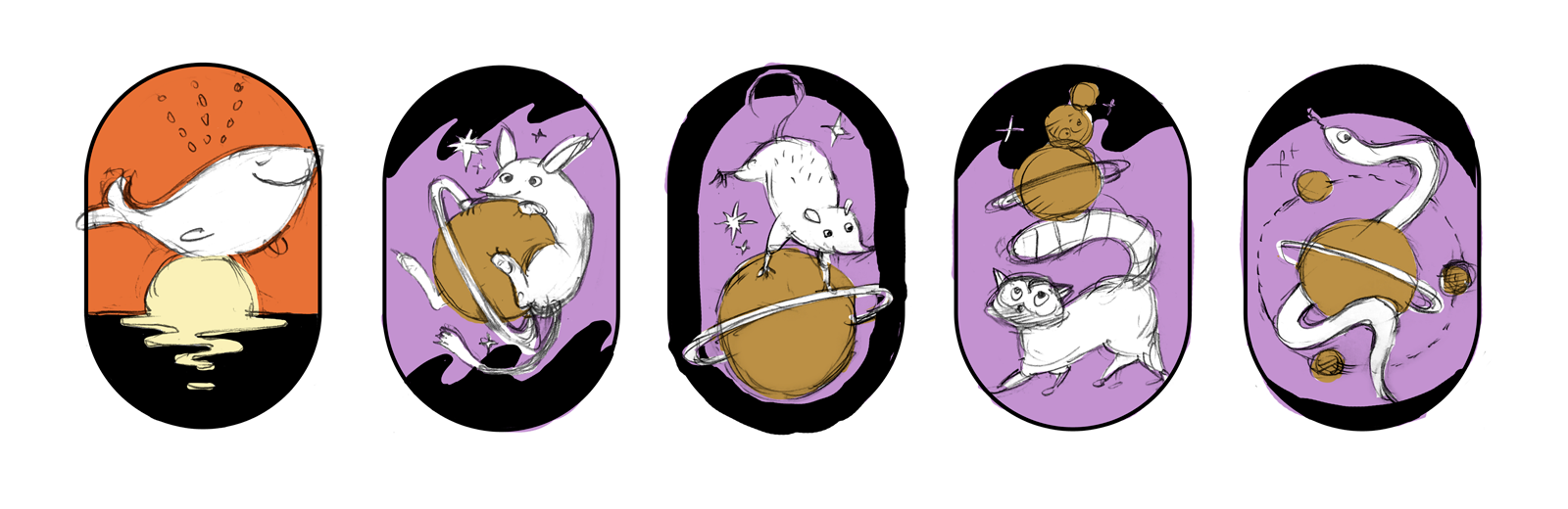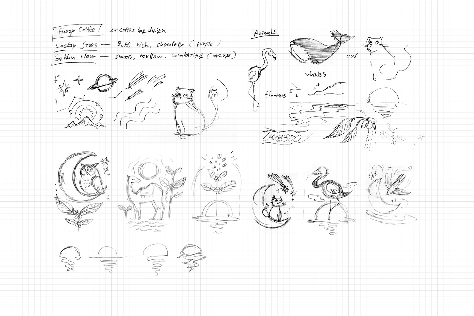 For Golden Hour, I explored animals that resonate with a sunset backdrop, such as flamingos and camels. For Lucky Stars, I considered nocturnal animals like cats, owls and possums.