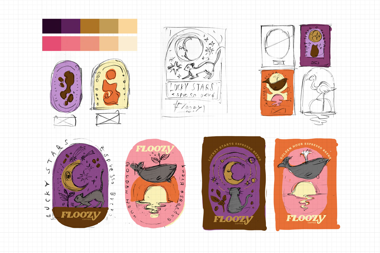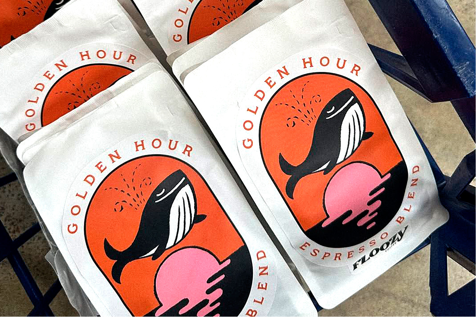 The owner, Kmac, discovered my work through their neighbour, Jam’s Karaoke, and approached me to redesign the labels for their two signature espresso blends: Golden Hour and Lucky Stars. She was seeking a fresh visual interpretation in a minimal style with bold colours, reflecting the fun and cool vibe that Floozy represents.