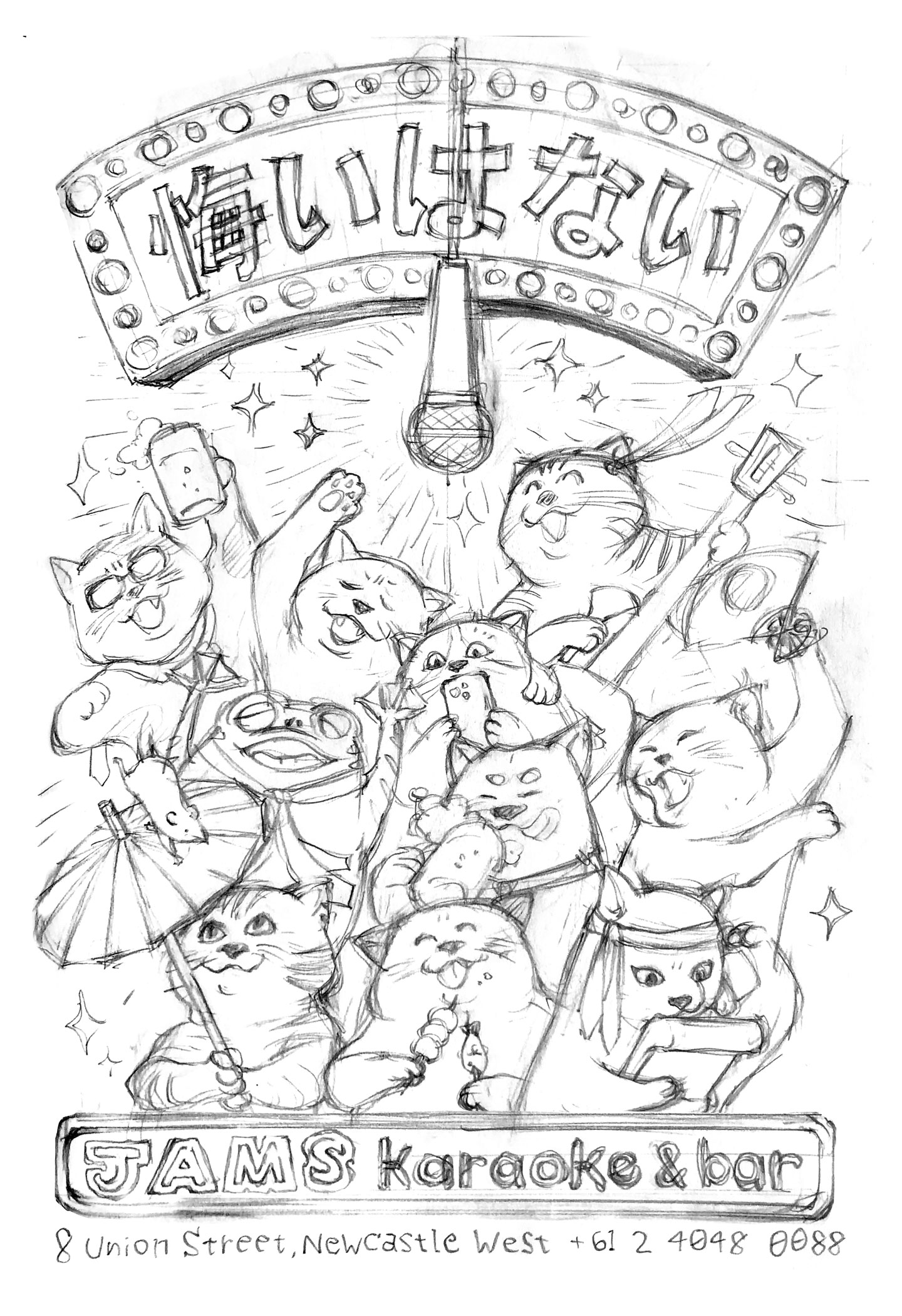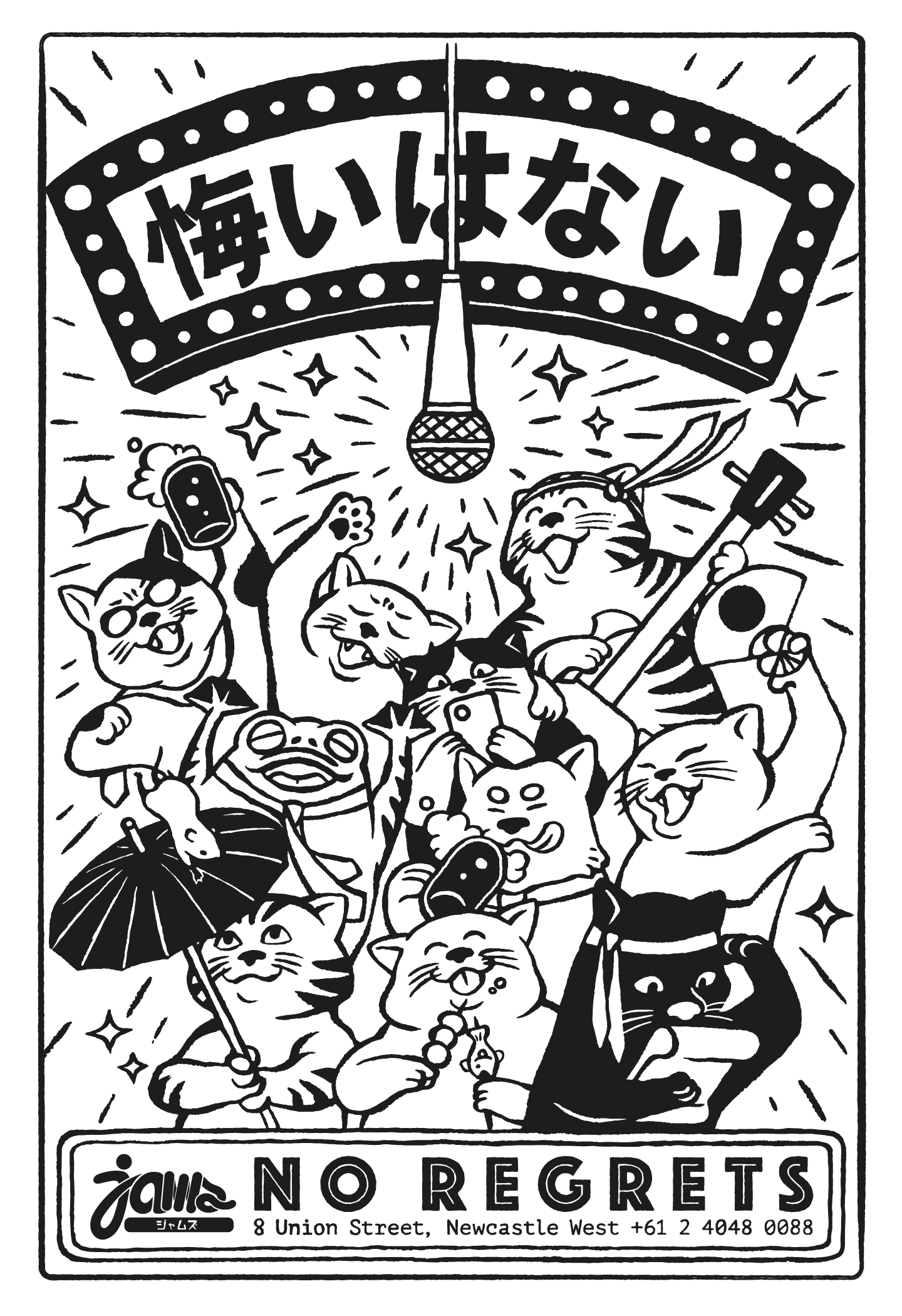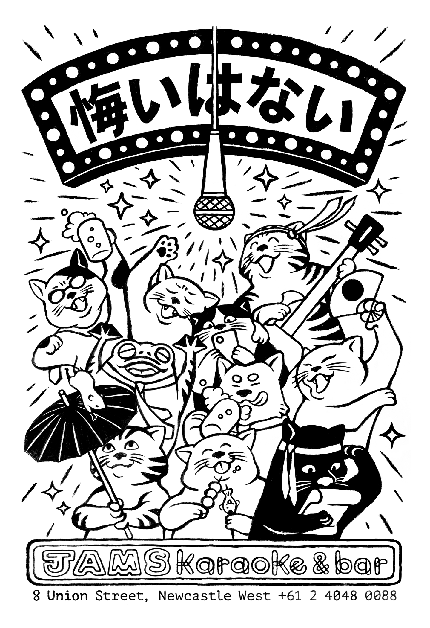 The second design shows a group of salarymen cats with their friend, a dog and a frog, letting loose at karaoke on stage. This is an ode to drunken Japanese salarymen as well as Jams regulars going wild at karaoke on a Friday night.