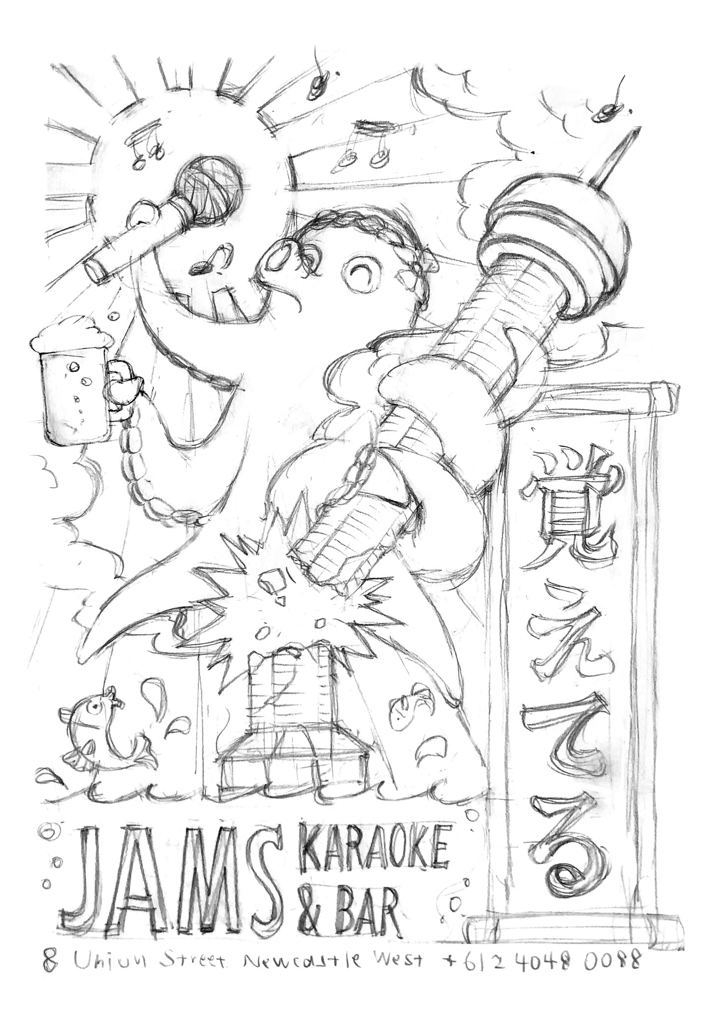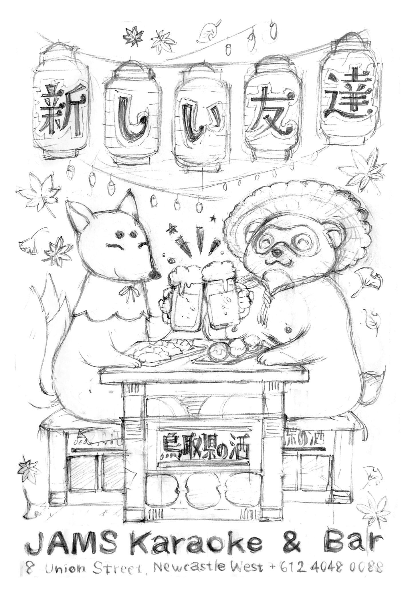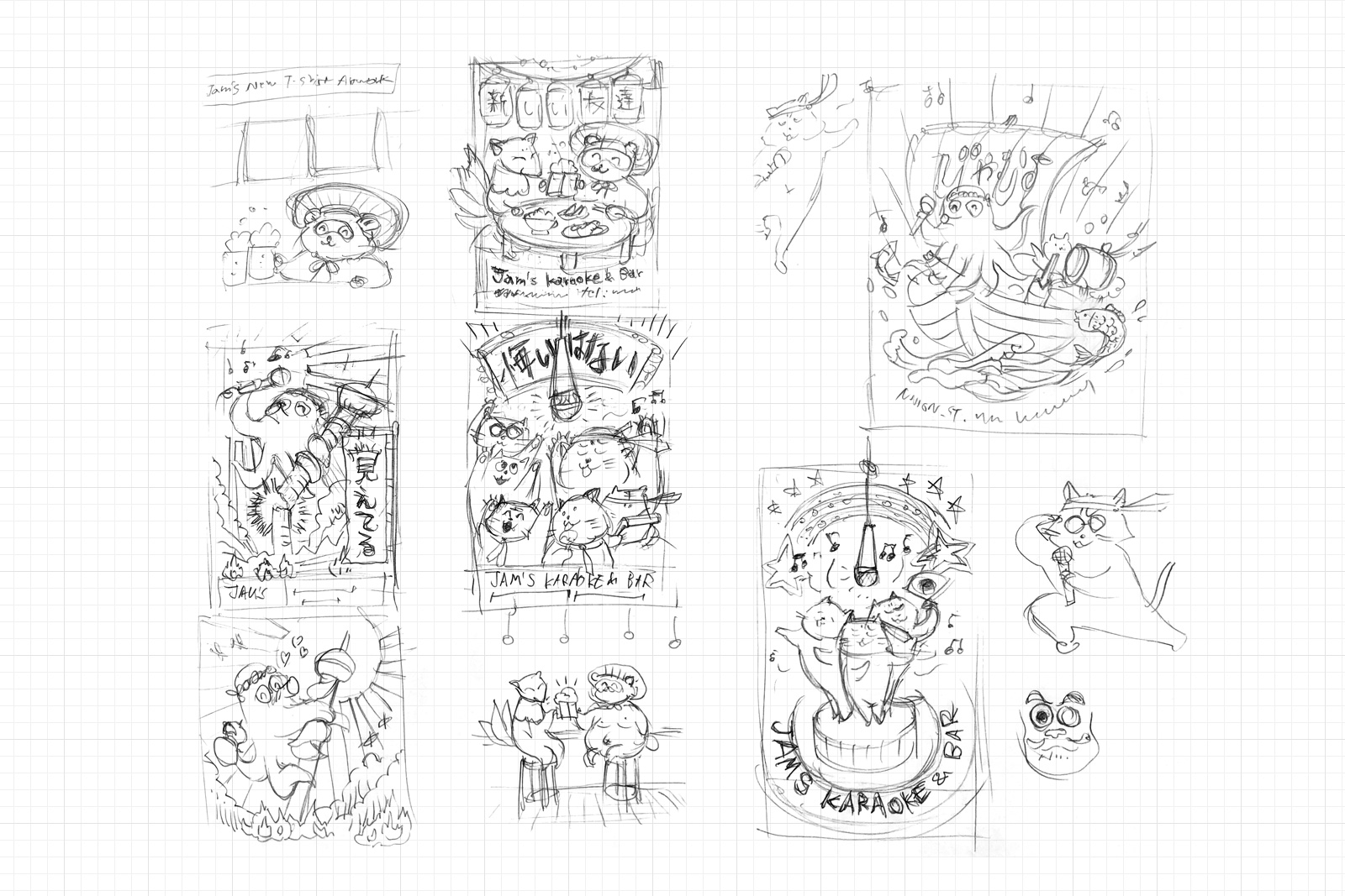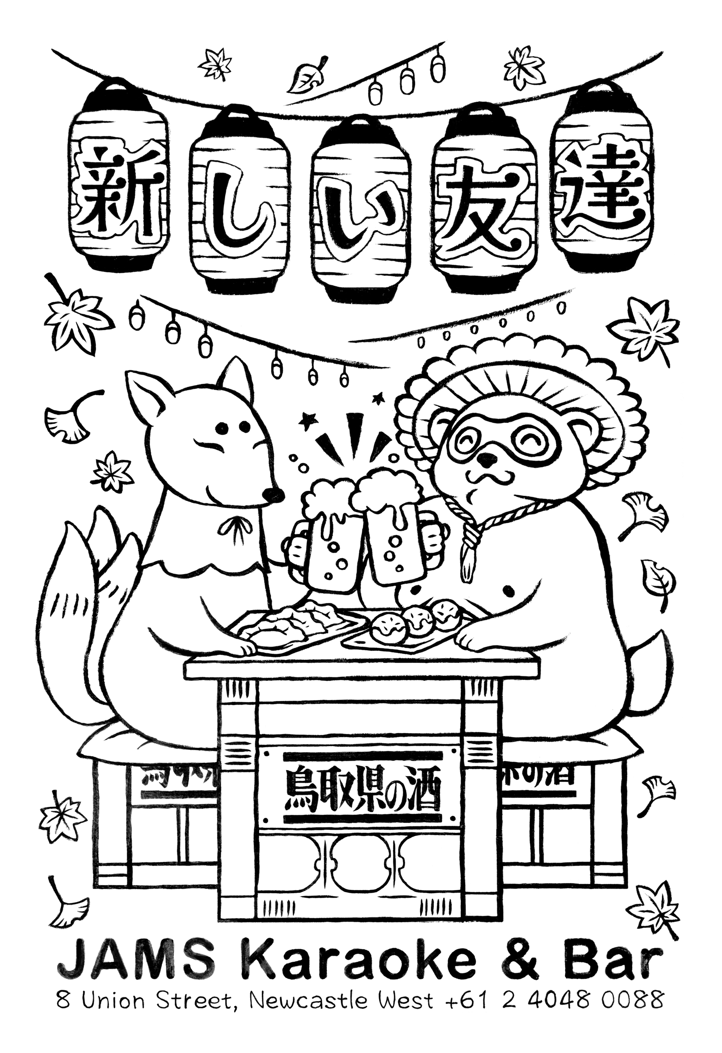 The second design shows a group of salarymen cats with their friend, a dog and a frog, letting loose at karaoke on stage. This is an ode to drunken Japanese salarymen as well as Jams regulars going wild at karaoke on a Friday night.