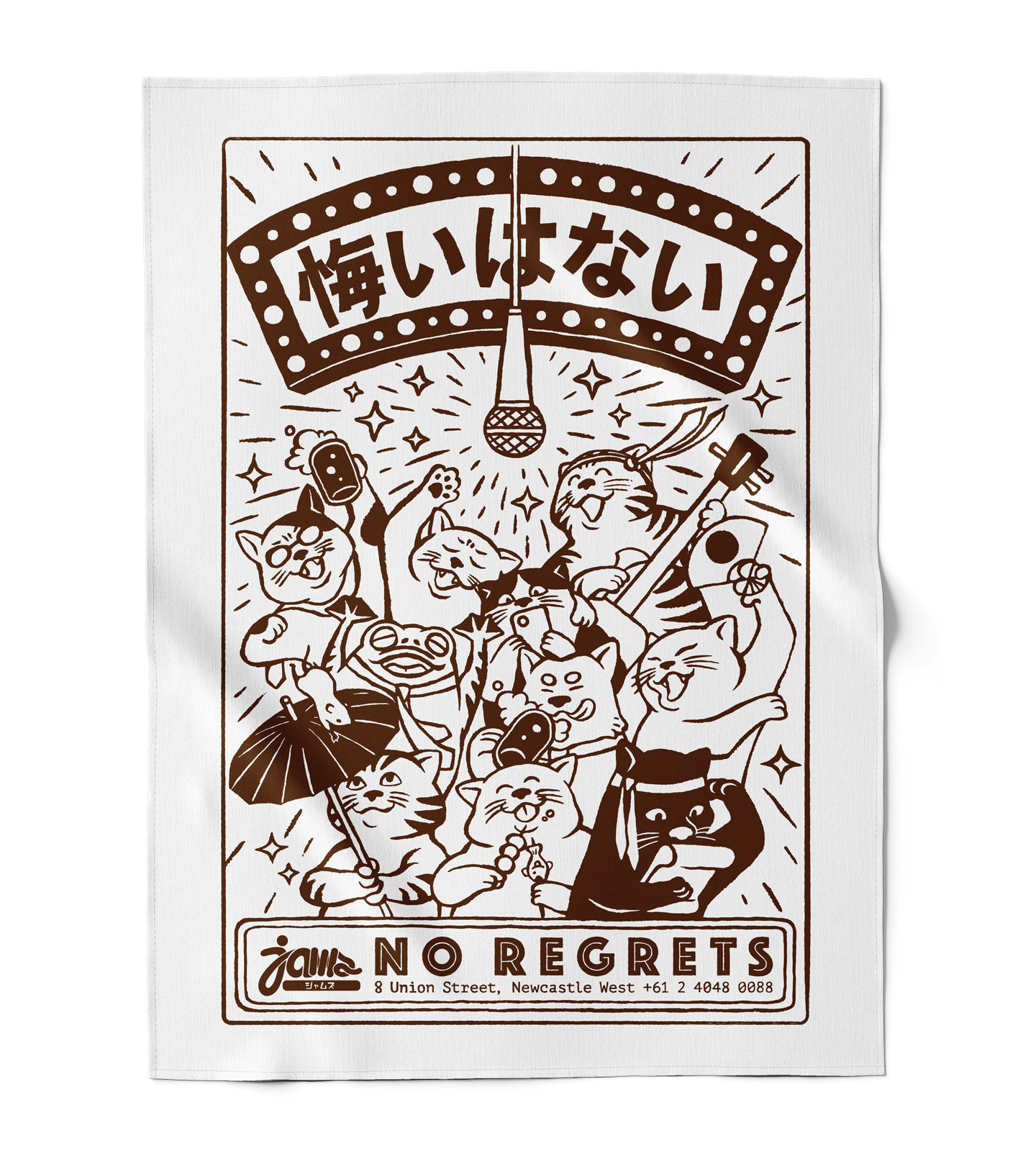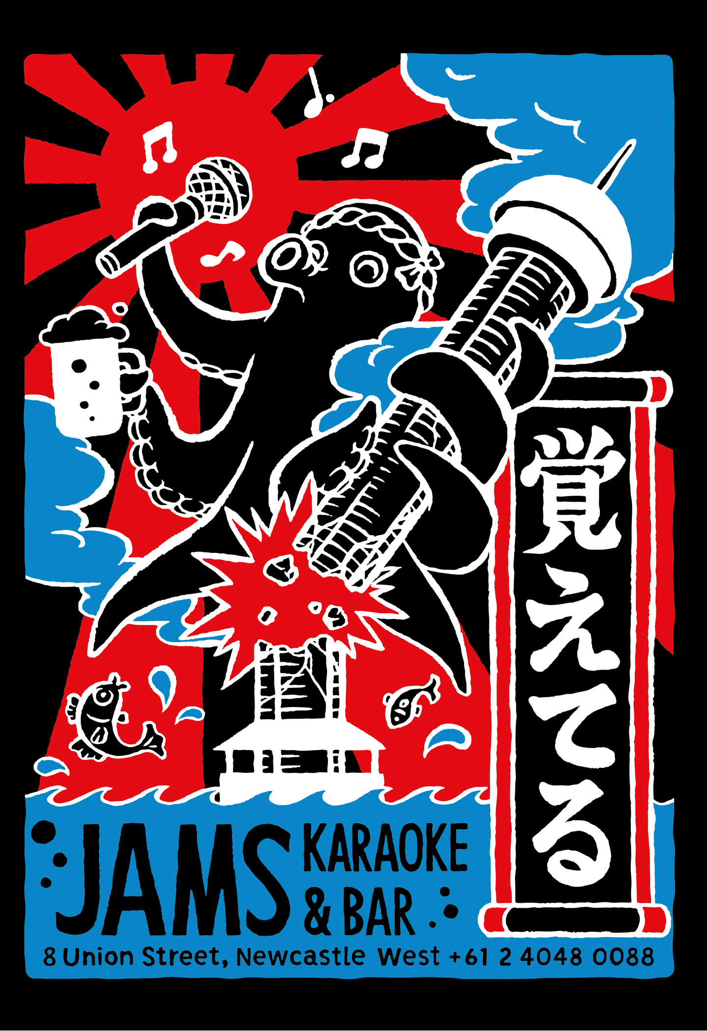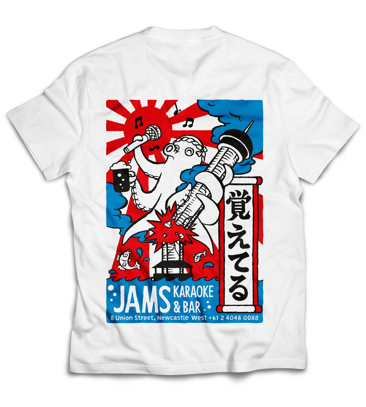 Jams, a karaoke bar inspired by Japanese karaoke and izakaya culture, has been claiming the spotlight in Newcastle’s party scene on Australia’s East Coast. Following the collaboration for the uniform t-shirt design back in 2020, I was brought back to create a new t-shirt and two tea towel designs.