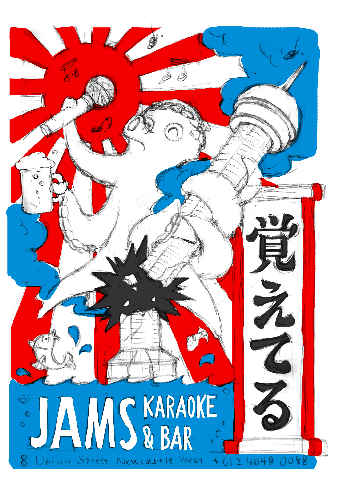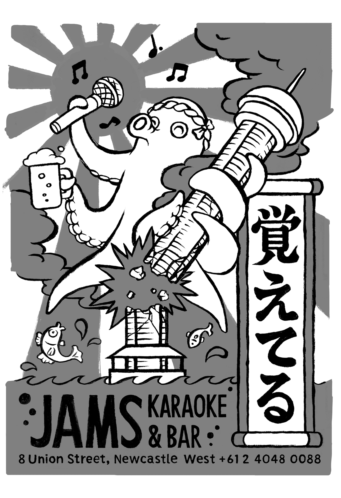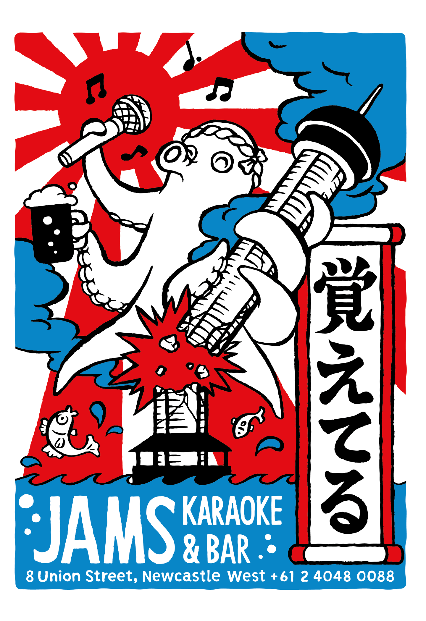 Jams, a karaoke bar inspired by Japanese karaoke and izakaya culture, has been claiming the spotlight in Newcastle’s party scene on Australia’s East Coast. Following the collaboration for the uniform t-shirt design back in 2020, I was brought back to create a new t-shirt and two tea towel designs.