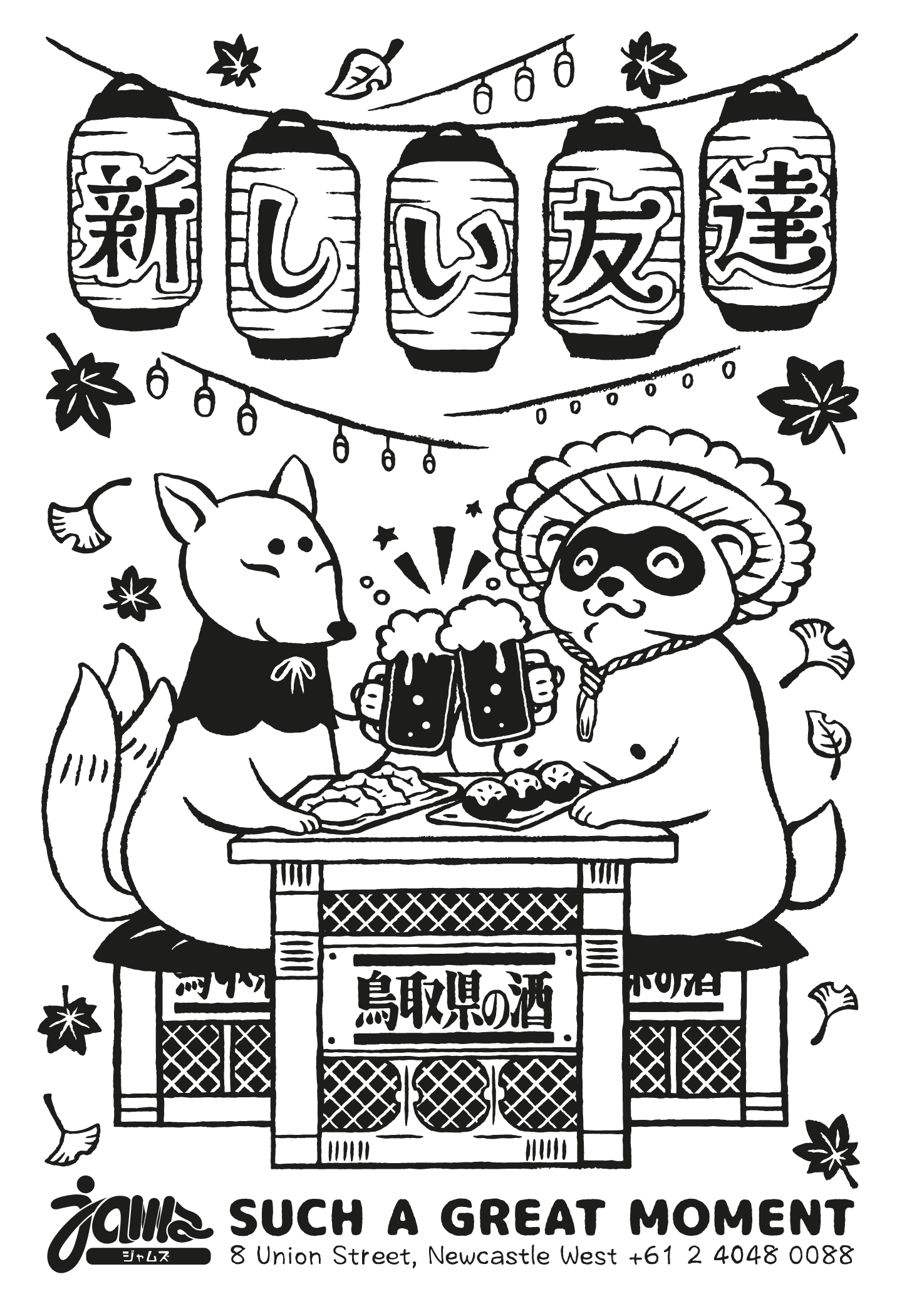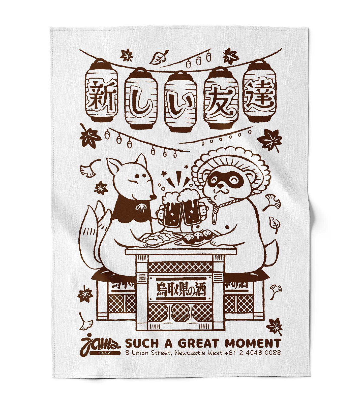 The first design depicts a fox and a tanuki (Japanese raccoon), often appeared as the rival in Japanese folklore, setting aside their differences to share a drink and enjoy each other’s company. It symbolises Jams as a place to connect with strangers and create unforgettable memories together.